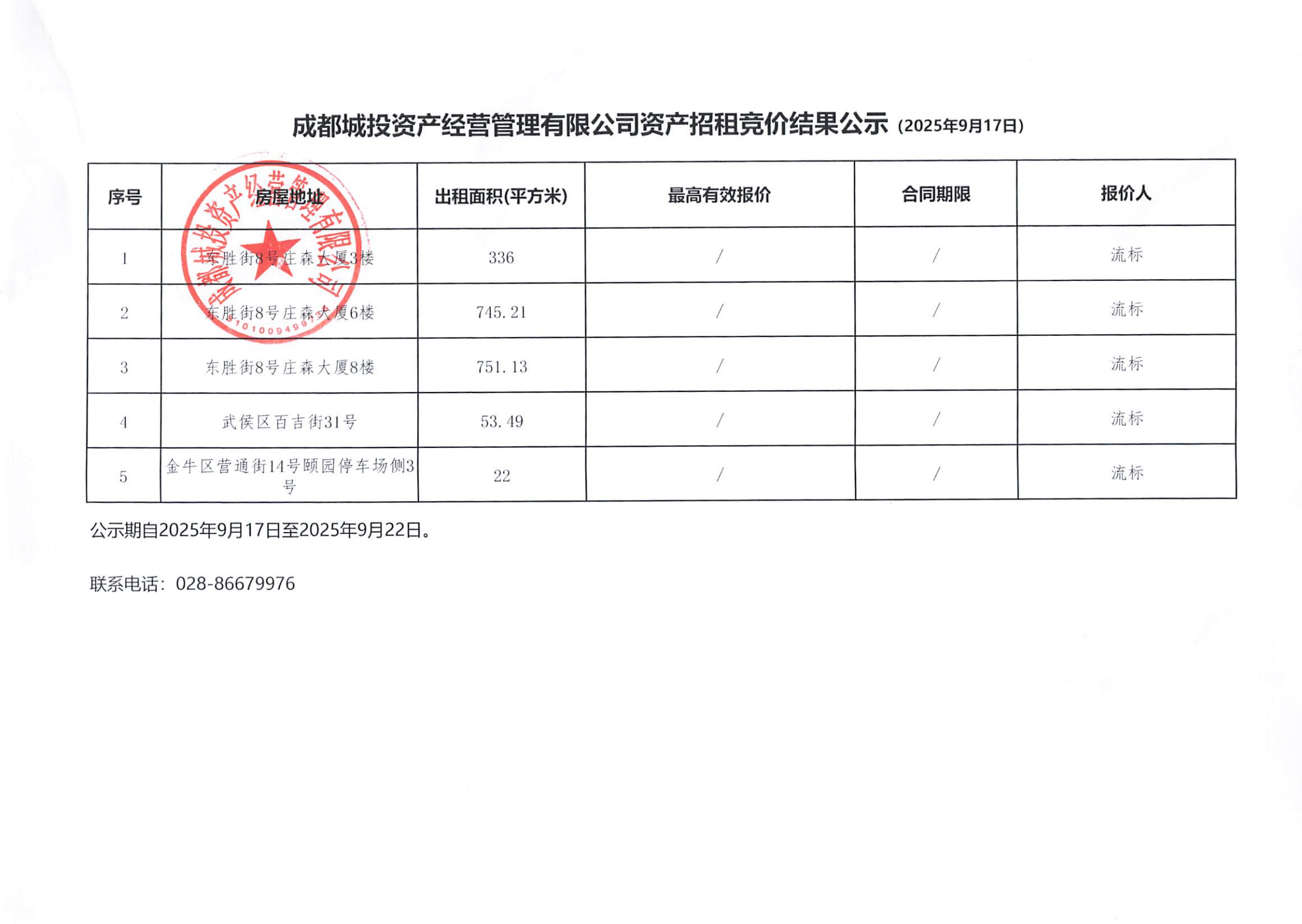 成都城投资产经营管理有限公司资产招租竞价结果公示(洞子口北街6号、桃源街57号等资产)