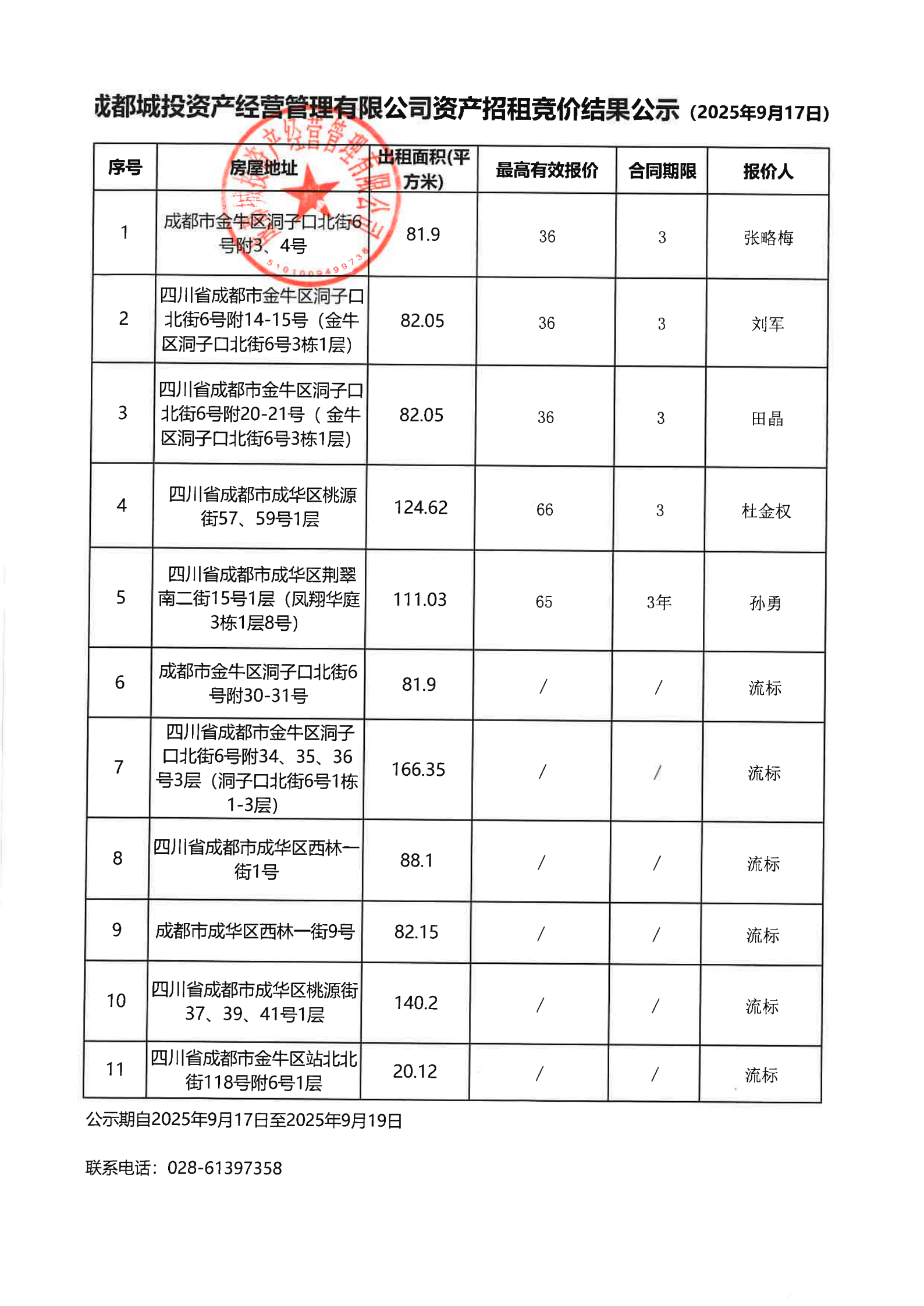 成都城投资产经营管理有限公司资产招租竞价结果公示(洞子口北街6号、桃源街57号等资产)