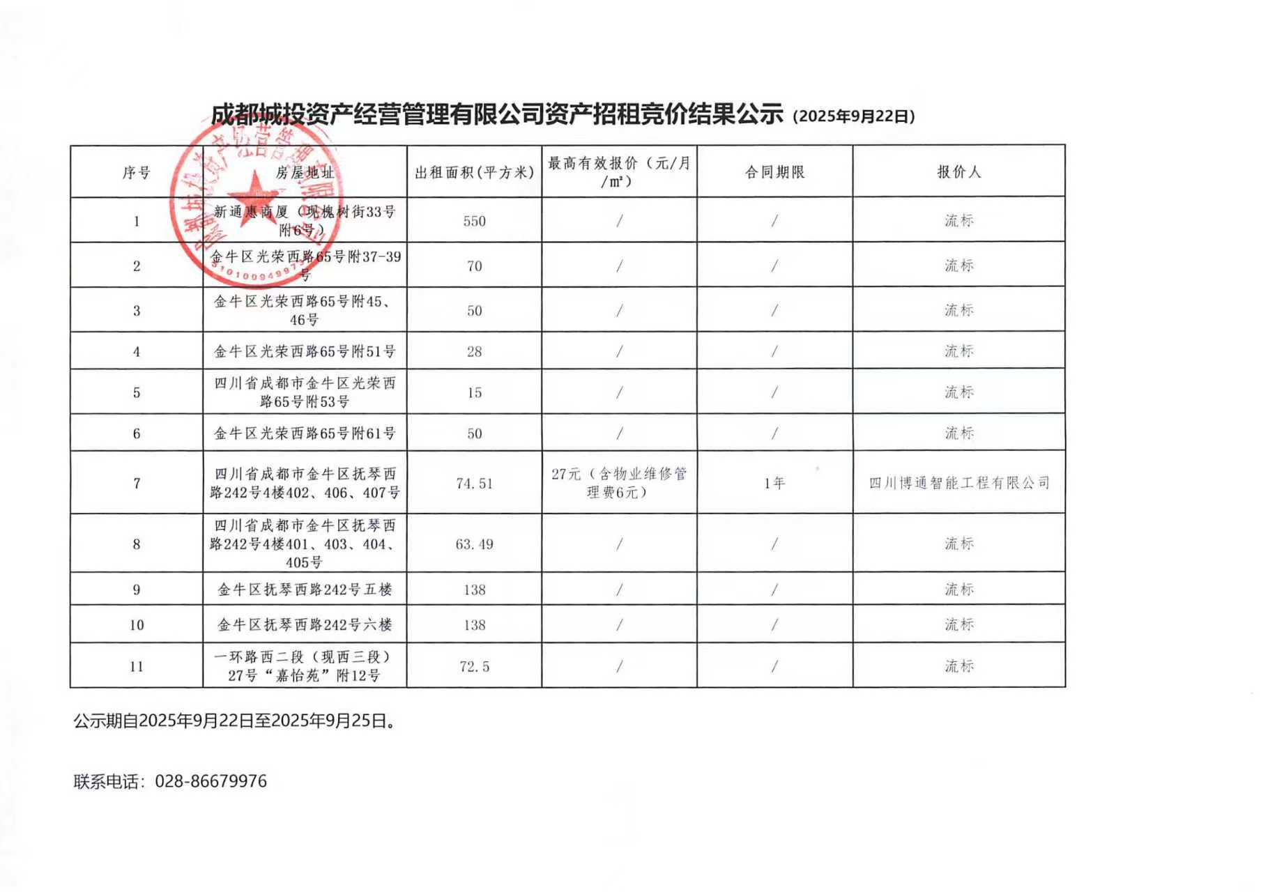 成都城投资产经营管理有限公司资产招租竞价结果公示(槐树街33号、光荣西路65号等资产)