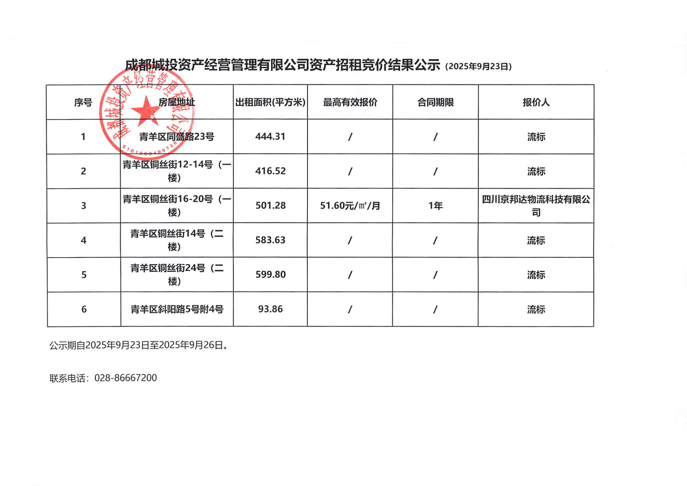 成都城投资产经营管理有限公司资产招租竞价结果公示(同盛路23号、铜丝街12号等资产)