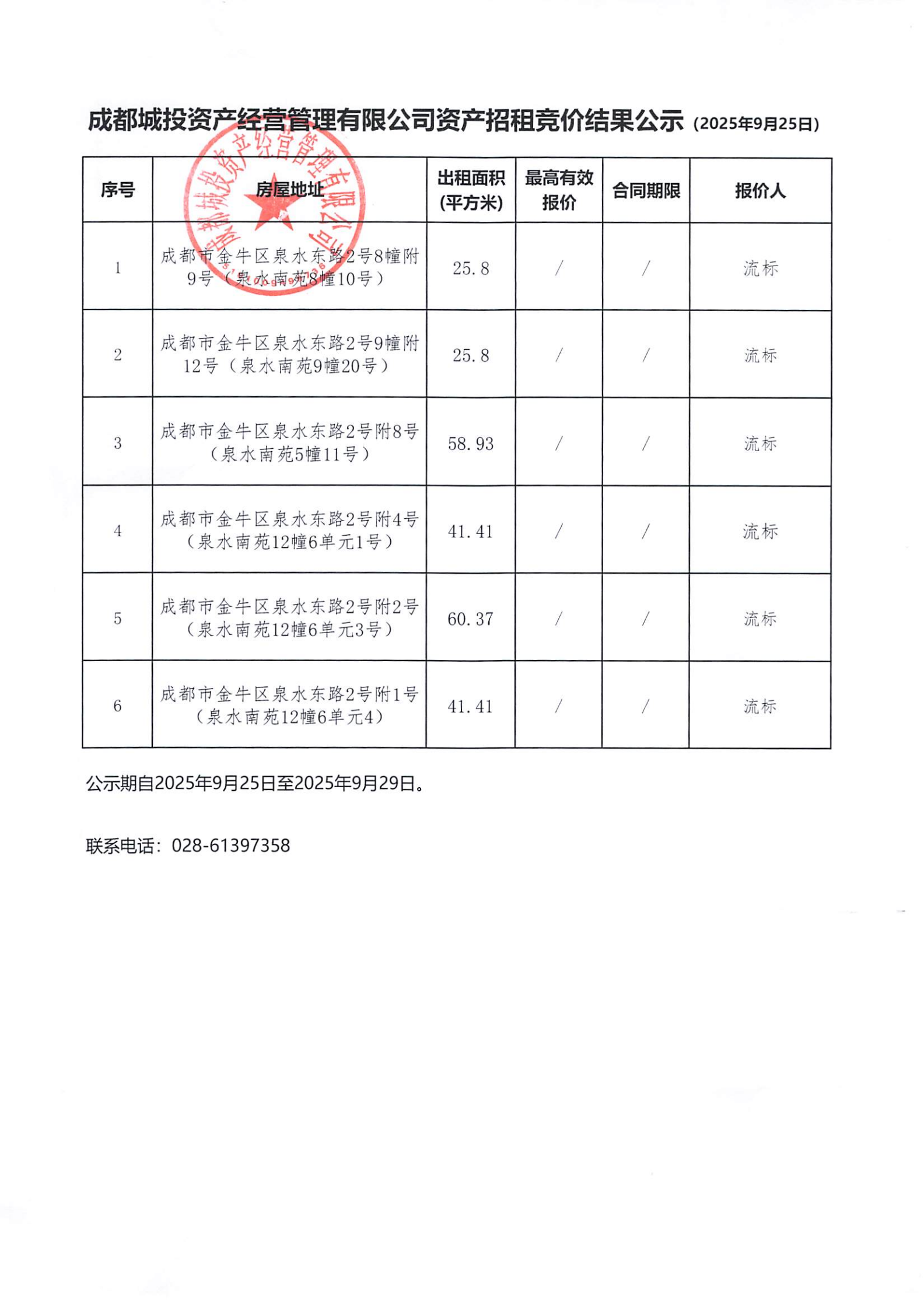 成都城投资产经营管理有限公司资产招租竞价结果公示(泉水东路2号等资产)