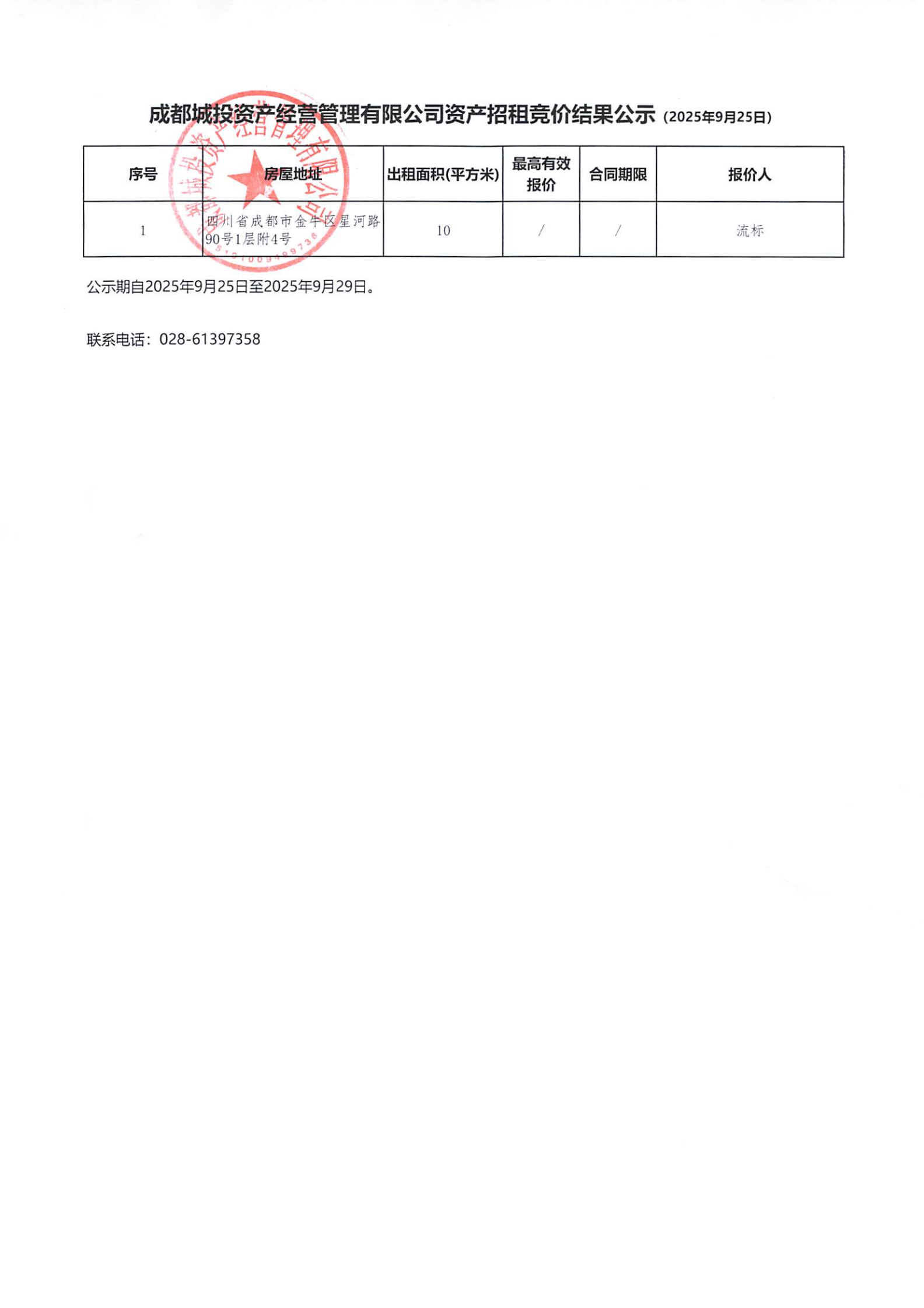 成都城投资产经营管理有限公司资产招租竞价结果公示(星河路90号等资产)