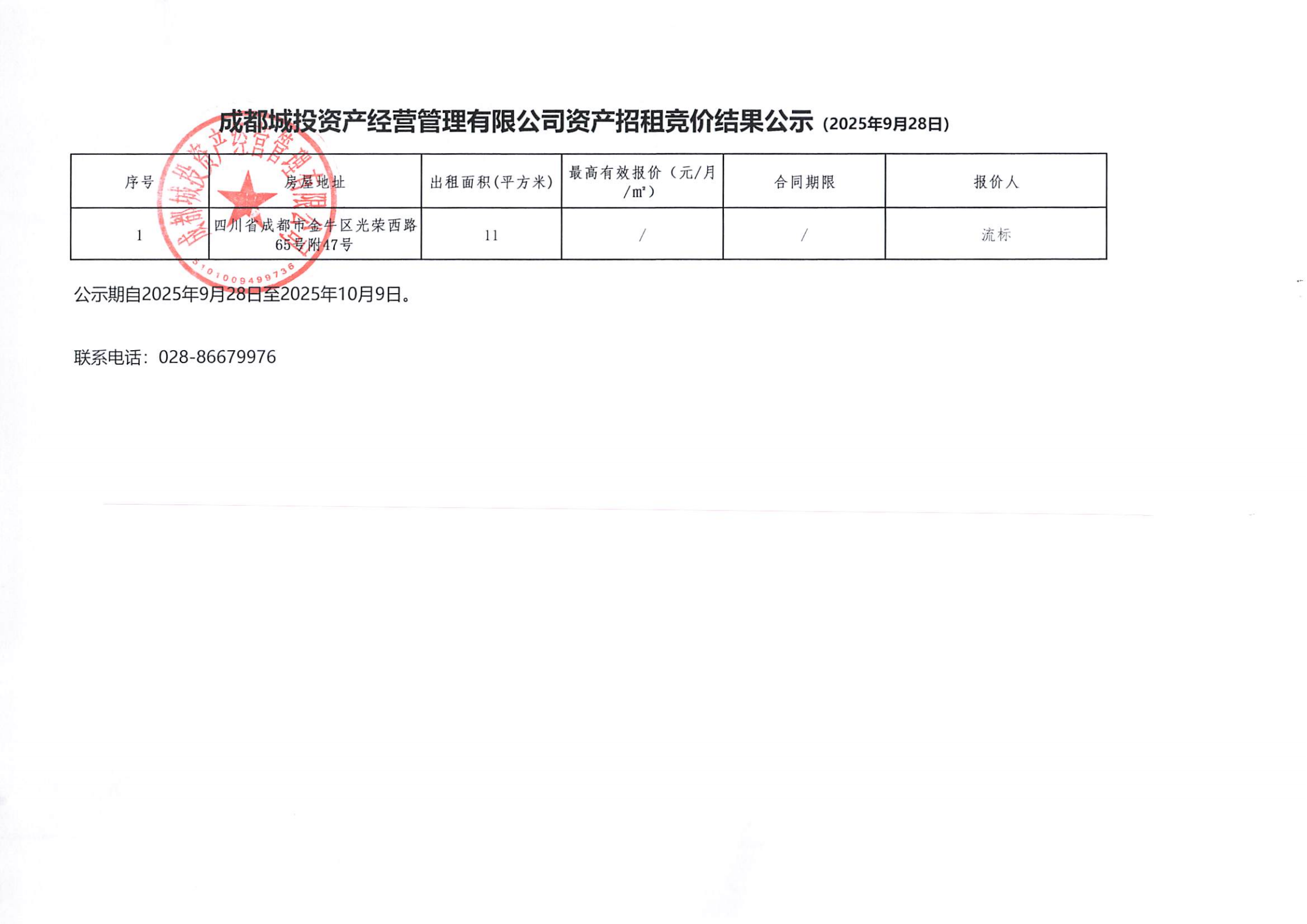 成都城投资产经营管理有限公司资产招租竞价结果公示(光荣西路65号资产)