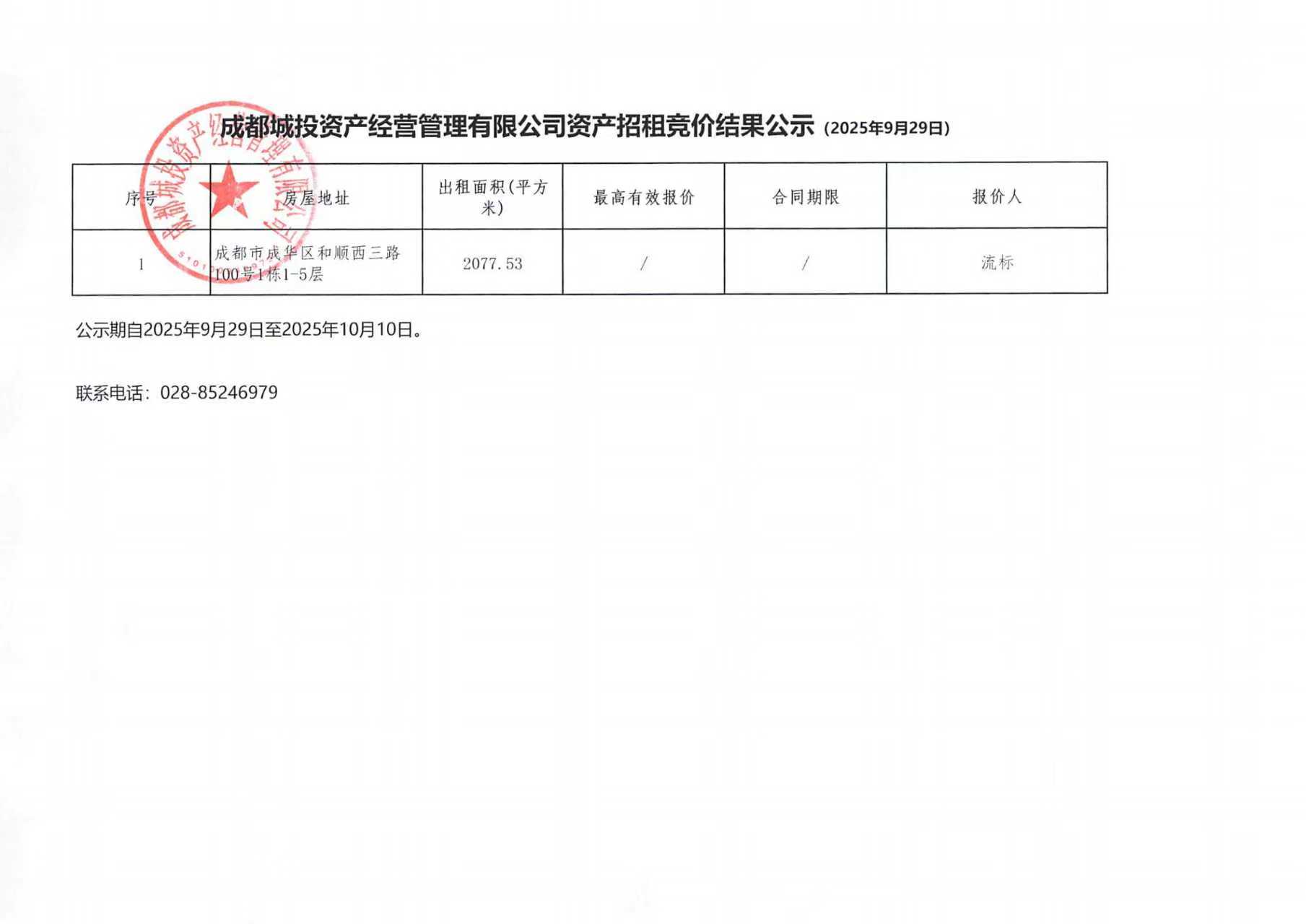 成都城投资产经营管理有限公司资产招租竞价结果公示(和顺西三路100号资产)