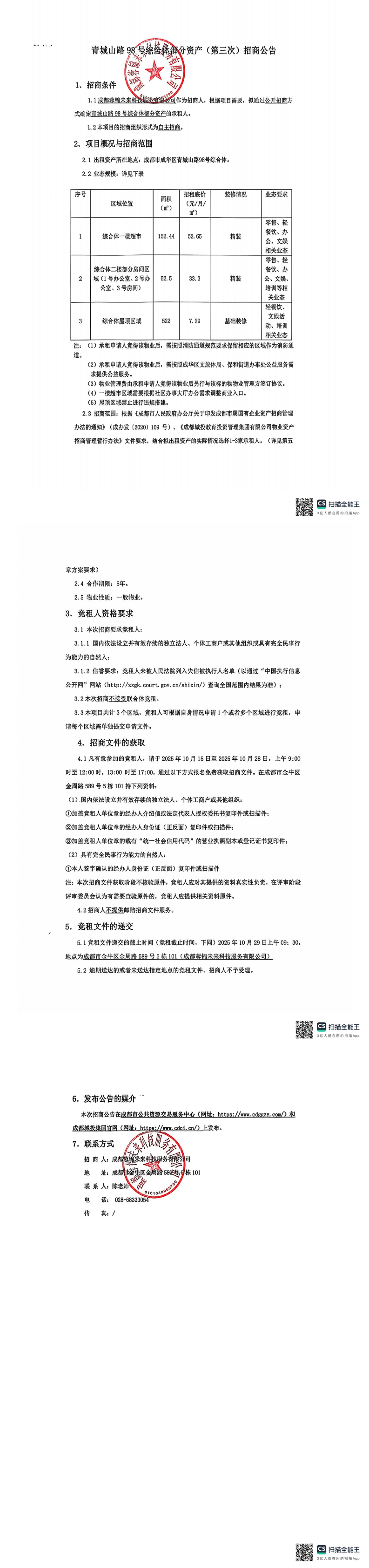 成都蓉锦未来科技服务公司招商公告(青城山路98号综合体部分资产)