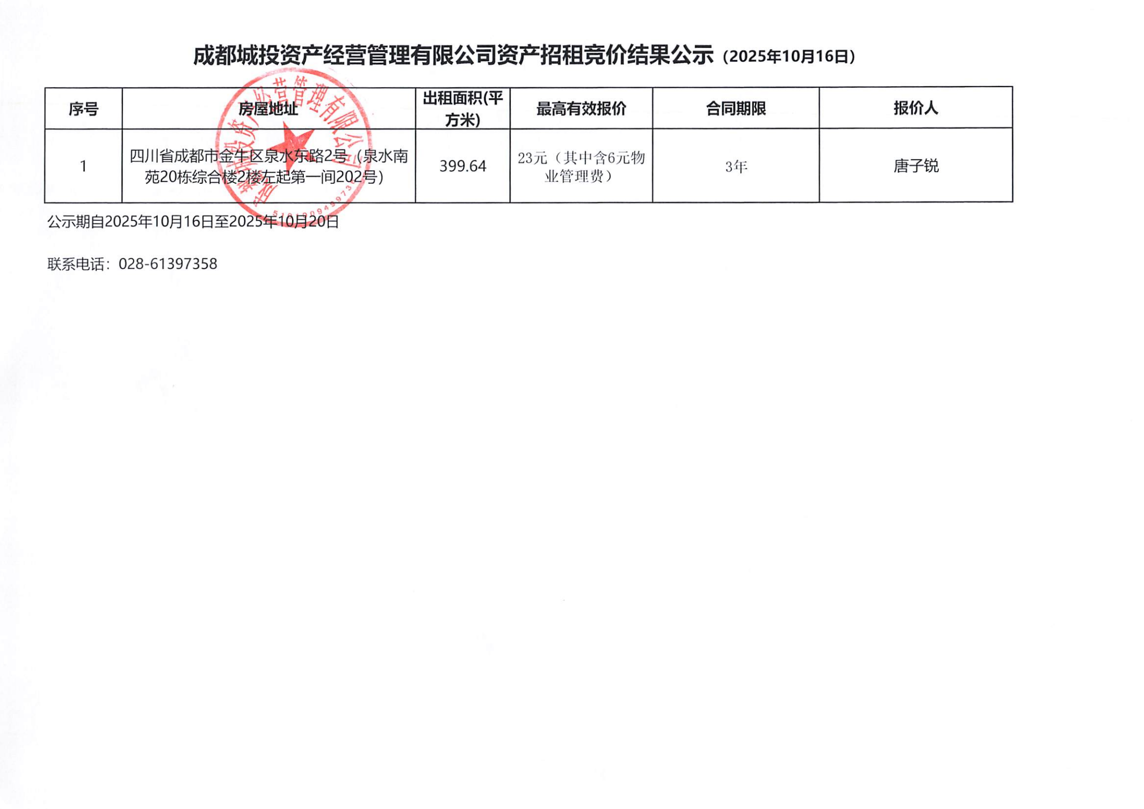 成都城投资产经营管理有限公司资产招租竞价结果公示(泉水东路2号等)