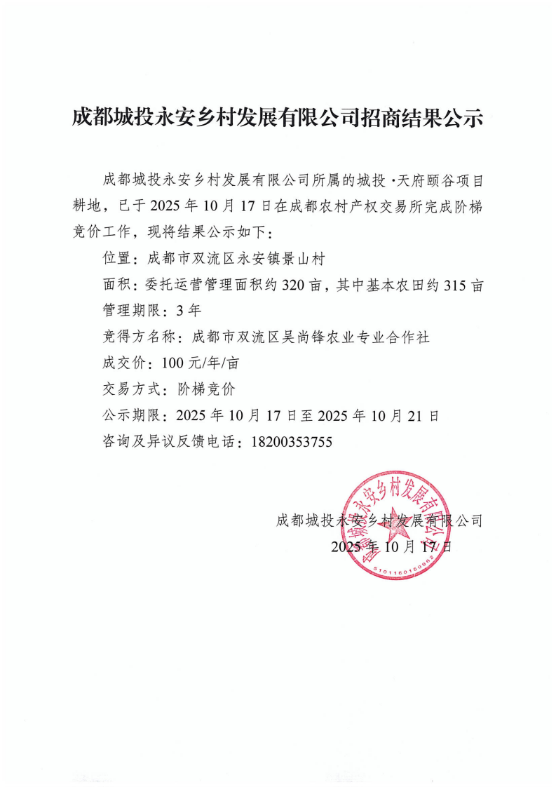 成都城投永安乡村发展有限公司招商结果公示(城投·天府颐谷)