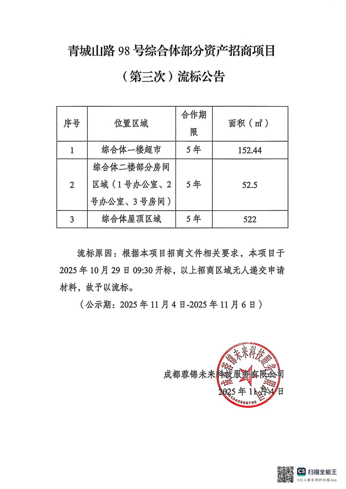成都蓉锦未来科技服务公司招商项目流标公告(青城山路98号)