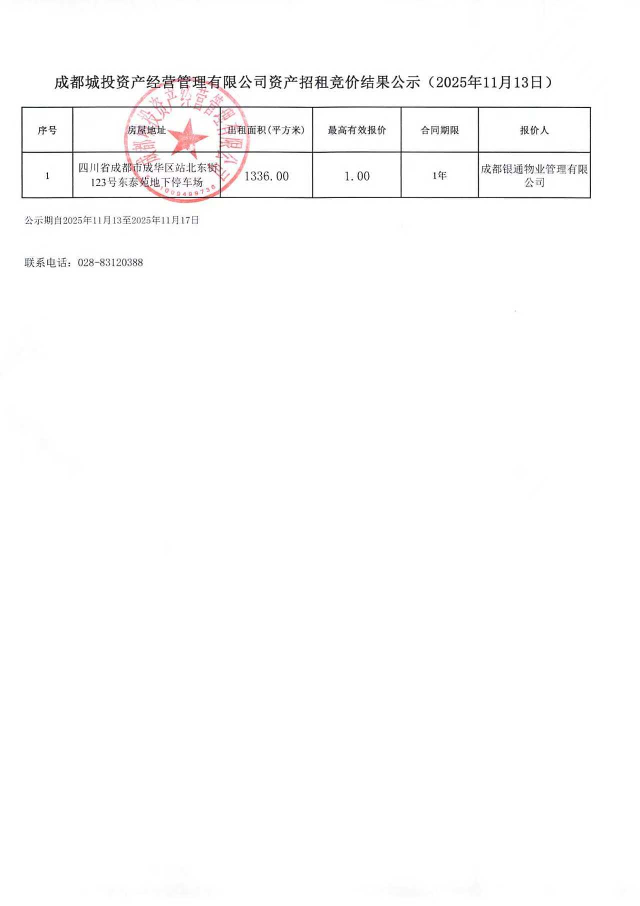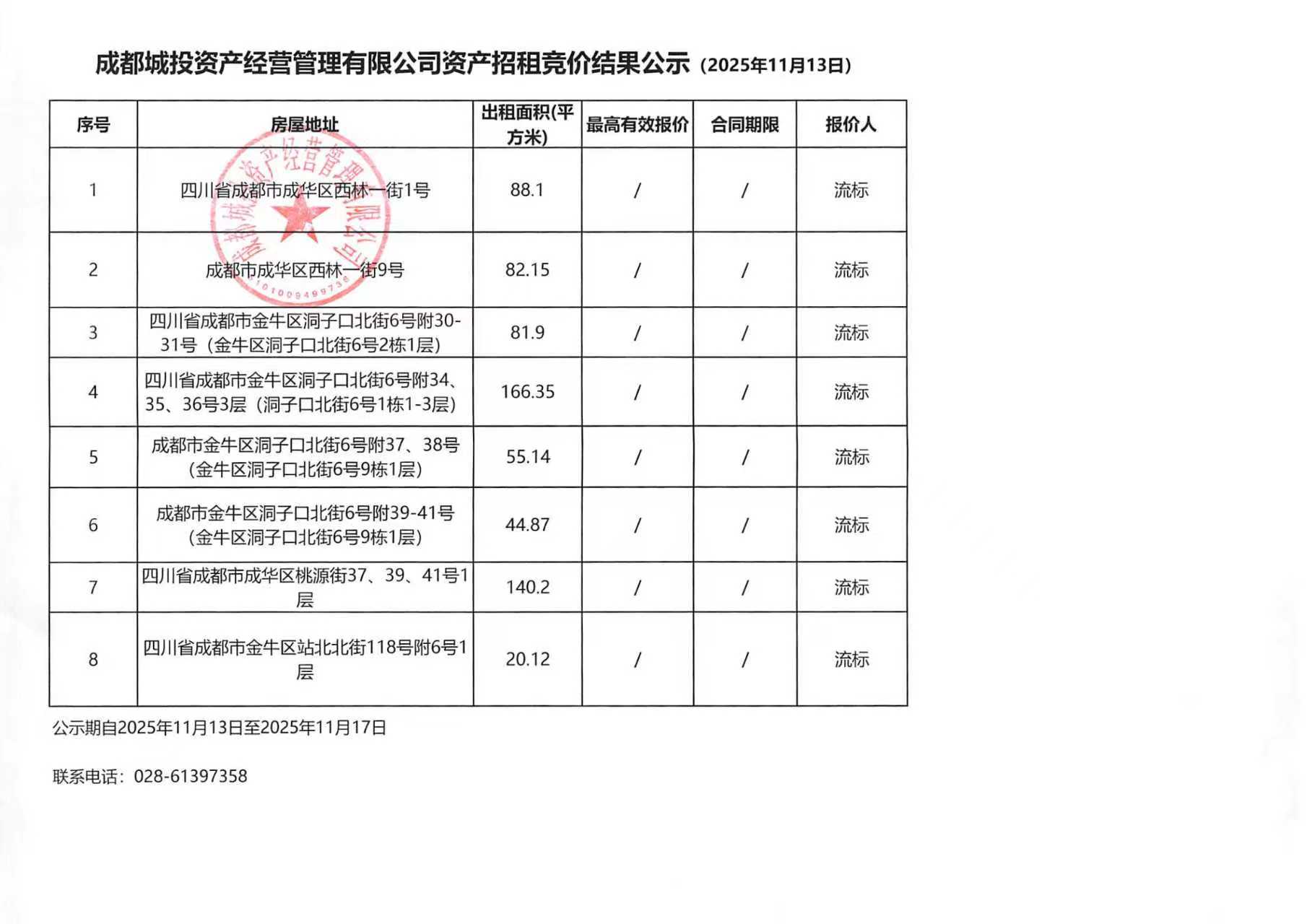 成都城投资产经营管理有限公司资产招租竞价结果公示(西林一街1号等)