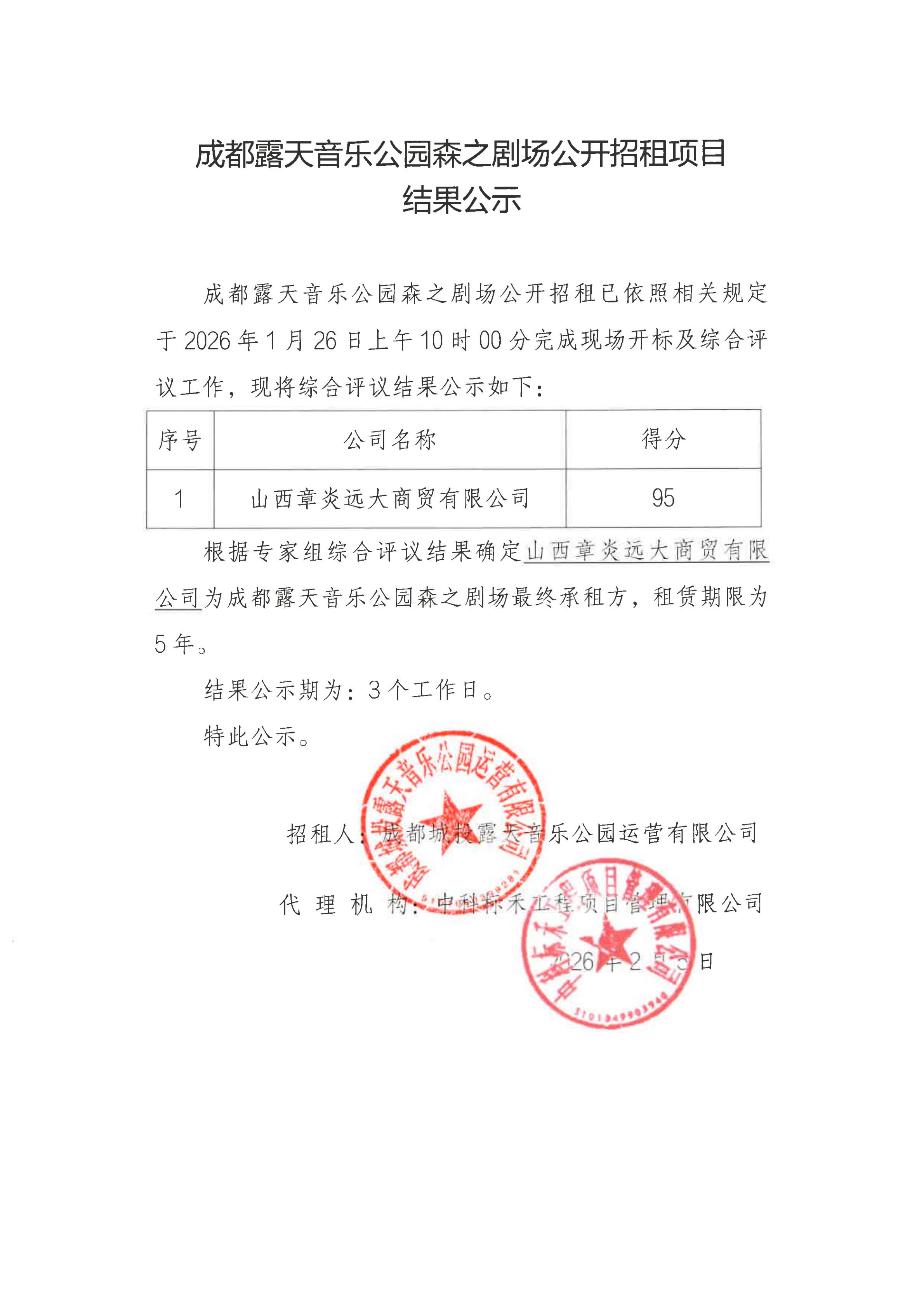 成都露天音乐公园森之剧场公开招租项目结果公示