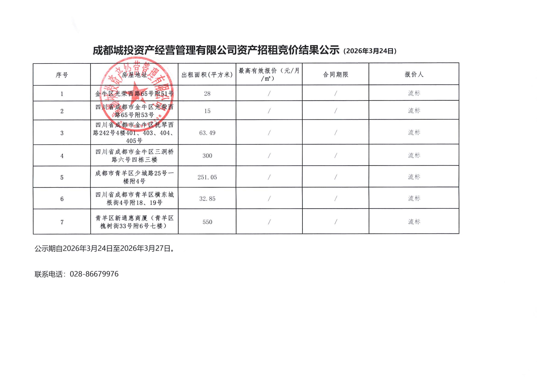 青羊区同盛路23号、青羊区铜丝街12-14号等五处资产招租竞价结果公示